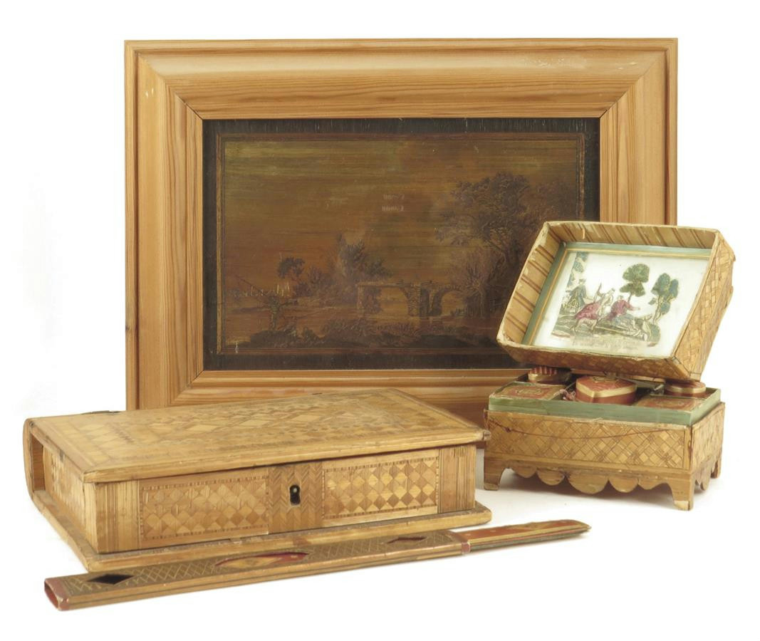 An early 19th century French prisoner of war straw work casket, the lift-off top inset a mirror revealing two coloured engravings above a lift-out tray fitted with a heart shape box and cover, two other boxes, above four further compartments and a cylindrical case, 11.3cm high, 12.2cm wide, together with a straw work box in the form of a book, the interior with lidded compartments, a straw work needle case with a pierced outer slip, and a straw work panel of a river scene. (4)