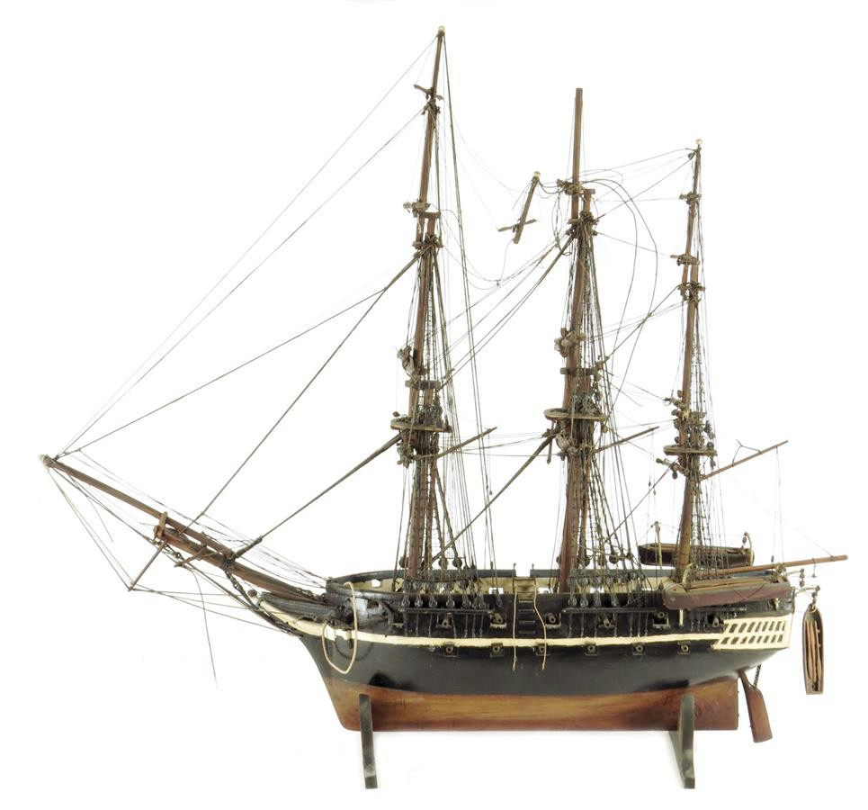 A painted wood model of a three masted man of war, with twenty-six brass cannon and a planked deck with a carved figurehead, 85cm high, 97cm wide.