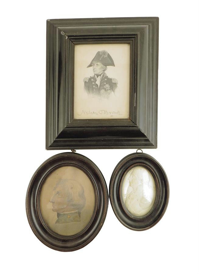Nelson interest. Three portraits of Admiral Lord Nelson in profile, one a coloured pencil drawing, one a plaster relief the other an engraving and inscribed 'Nelson Bronte', each in a glazed ebonized moulded frame, 19th century, 25 x 21.4cm, max. (3)