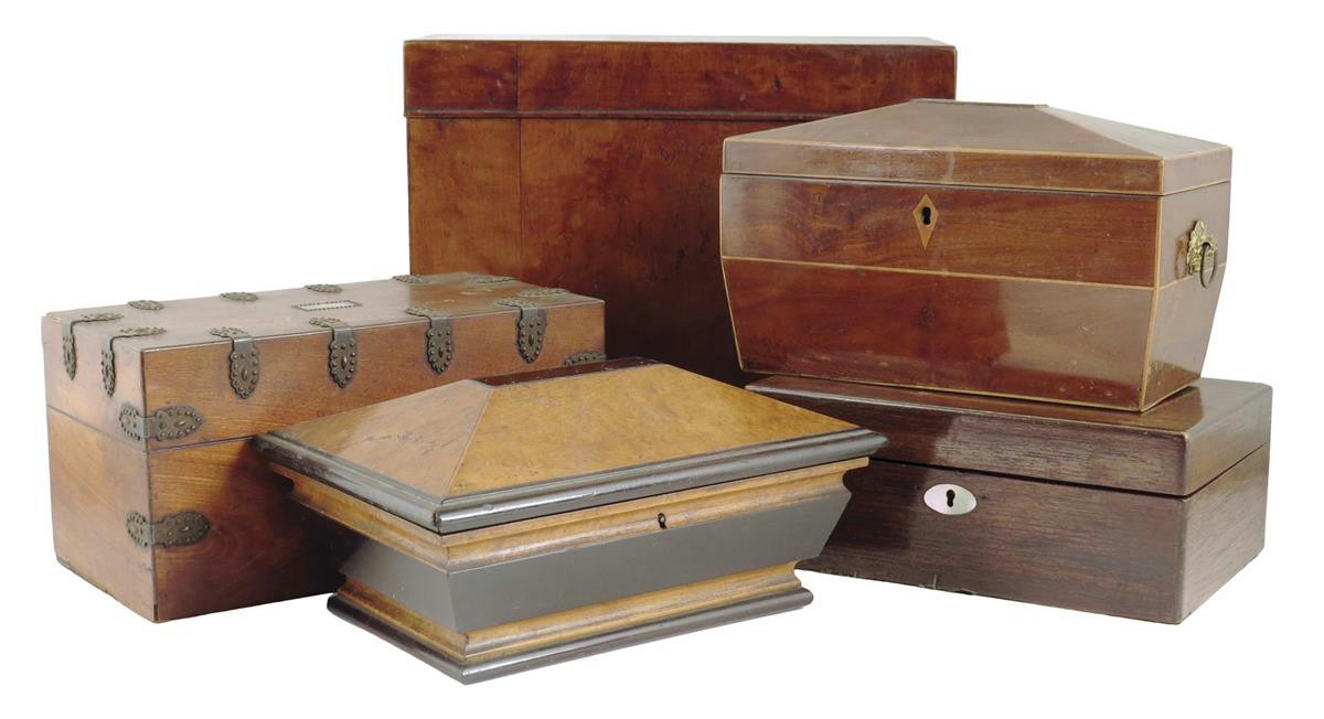 λA Regency mahogany sarcophagus shape tea caddy, with a converted interior, 25.2cm wide, a French satinwood and cut steel tea chest, a bird's eye maple and ebonized box, a maple decanter box, the interior with three divisions and a rosewood and mother of pearl work box. (5)