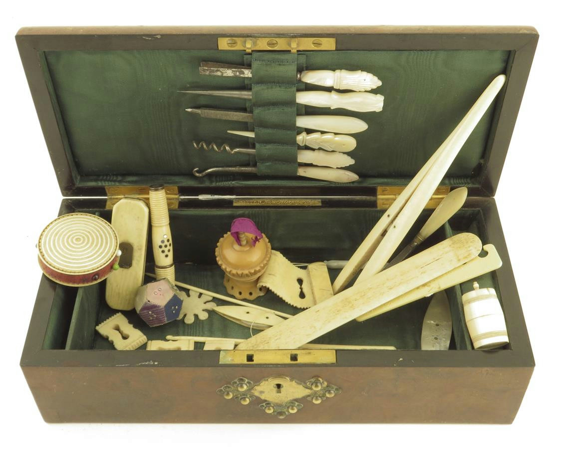 λA Victorian burr walnut and brass mounted work box by E. Baxter, the green silk lined interior containing an array of sewing utensils, including: an ivory glove stretcher, an ivory tooth pick box, a turned ivory pin cushion, bone and mother of pearl sewing shuttles, a vegetable ivory tape measure and mother of pearl handled implements with a brass makers plaque inscribed 'E. BAXTER, Maker, 16, Cockspur St. S.W', 8.7cm high, 26,8cm wide, 12.3cm deep.