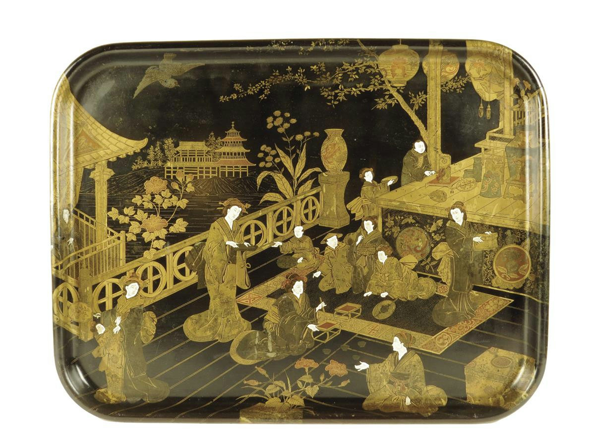 A late 19th century French papier-maché tray, decorated with a Japanese scene of figures and pagodas, 47.9 x 62.2cm.