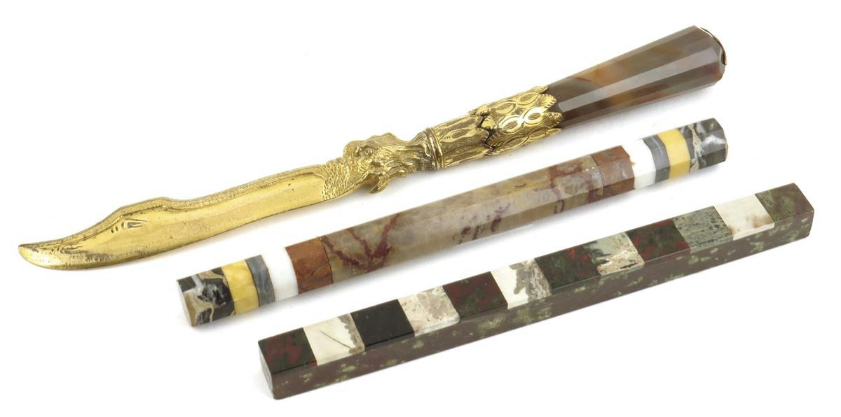 An early 19th century gilt metal and agate letter opener, with an eagle's head blade, 20.5cm long, together with two serpentine and hardstone rulers. (3)