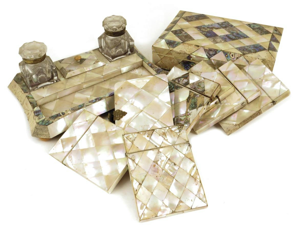 A small collection of Victorian mother of pearl items, comprising: an ink stand with cut glass bottles, a jewellery box with a mirrored interior, a purse, a hinged box and six card cases, 24cm wide, max. (10)
