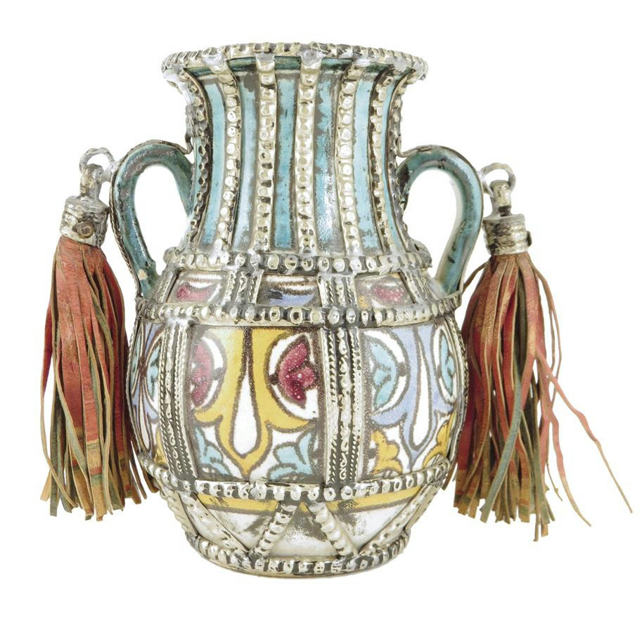 A Moroccan pottery and metal mounted twin handled vase, with leather tassels, late 19th / early 20th century, Fez, 13.5cm high, 13.3cm wide.