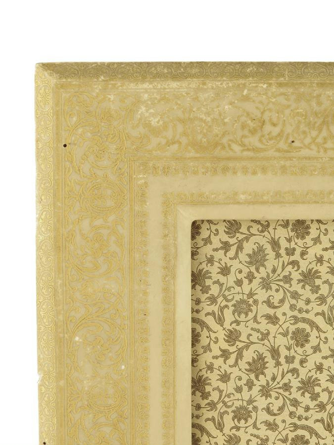 A vellum photograph frame, decorated in gilt with scrolling foliage, early 20th century, 50 x 40cm.