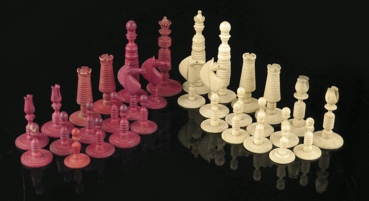 A 19th century turned bone chess set, natural and stained red, possibly Indian, king: 9.6cm high, pawn, 2.8cm high. together with a similar bone part chess set. (64)