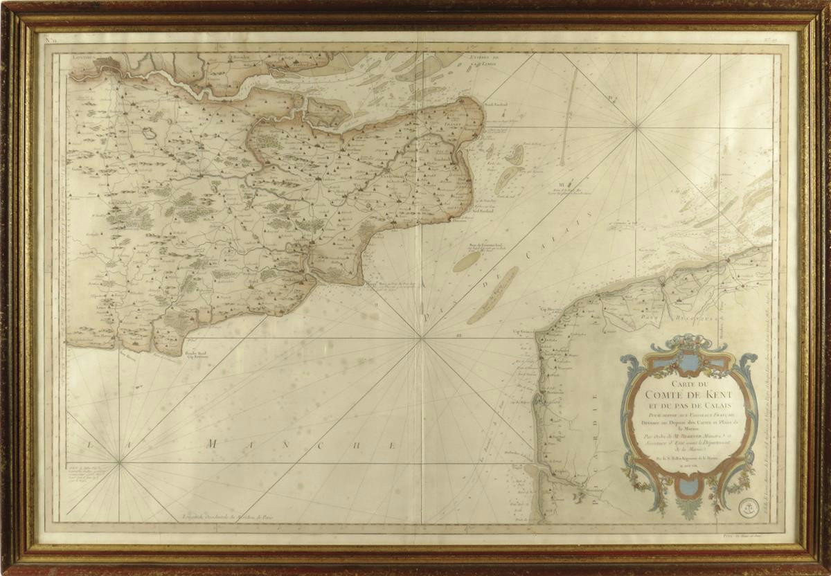 'Carte du Comté de Kent et du Pas de Calais' by S. Bellin, a hand coloured engraved map, dated '1749', 60 x 88.7cm, in a later glazed moulded frame, together with 'A New Map of the County of Cornwall' by Jones & Smith, Pentonville, a handcoloured engraved map, '2nd Edition Corrected to 1808'. (2)