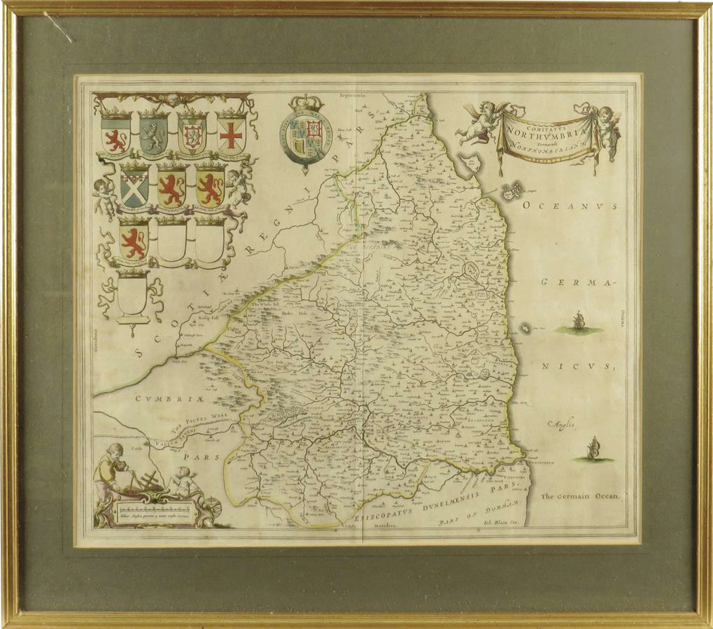 Johannes Blaeu. (Dutch, 1598-1673), 'COMITATUS NORTH UMBRIA, Vernacule, NORTHUMBERLAND', a hand coloured engraved map, circa 1645, 42 x 50.3cm, in a later glazed frame.