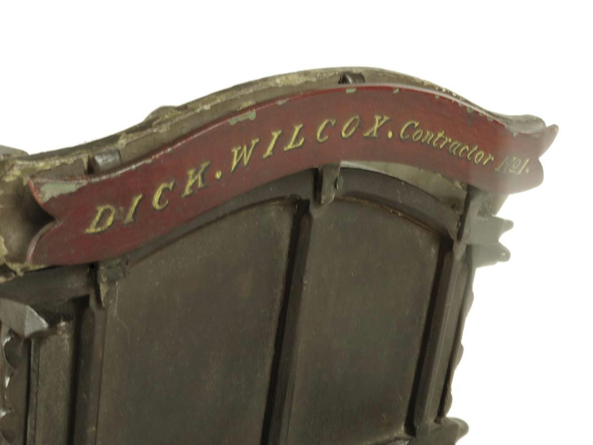 A 19th century painted wood and wrought iron model of a horse drawn farm cart, inscribed 'DICK WILCOX, Contractor No.1', together with some leather tack, 38cm high, 73.3cm long.