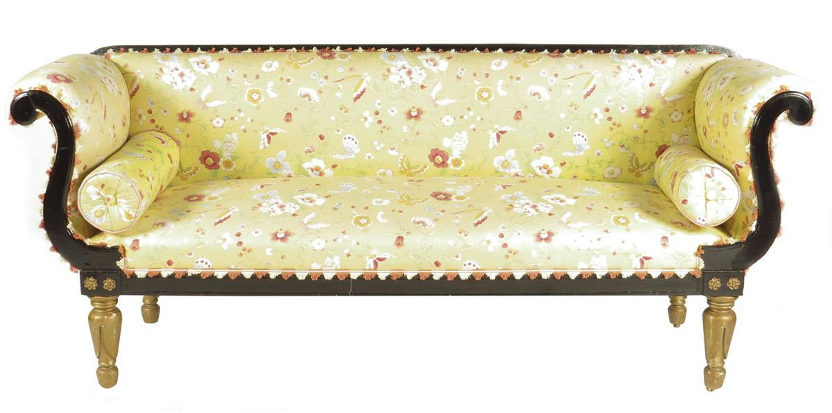 A William IV ebonized scroll end sofa, on lappet carved gilt legs and brass roller castors, 90.7cm high, 215cm wide, 67cm deep.