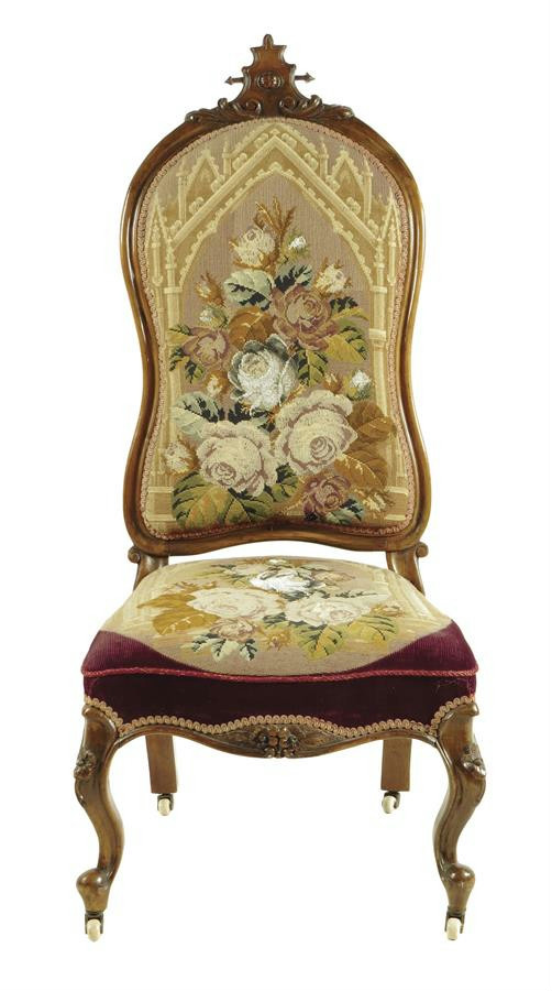 A Victorian walnut nursing chair, with needle and beadwork upholstery depicting Gothic buildings and flowers on carved cabriole legs and ceramic castors.