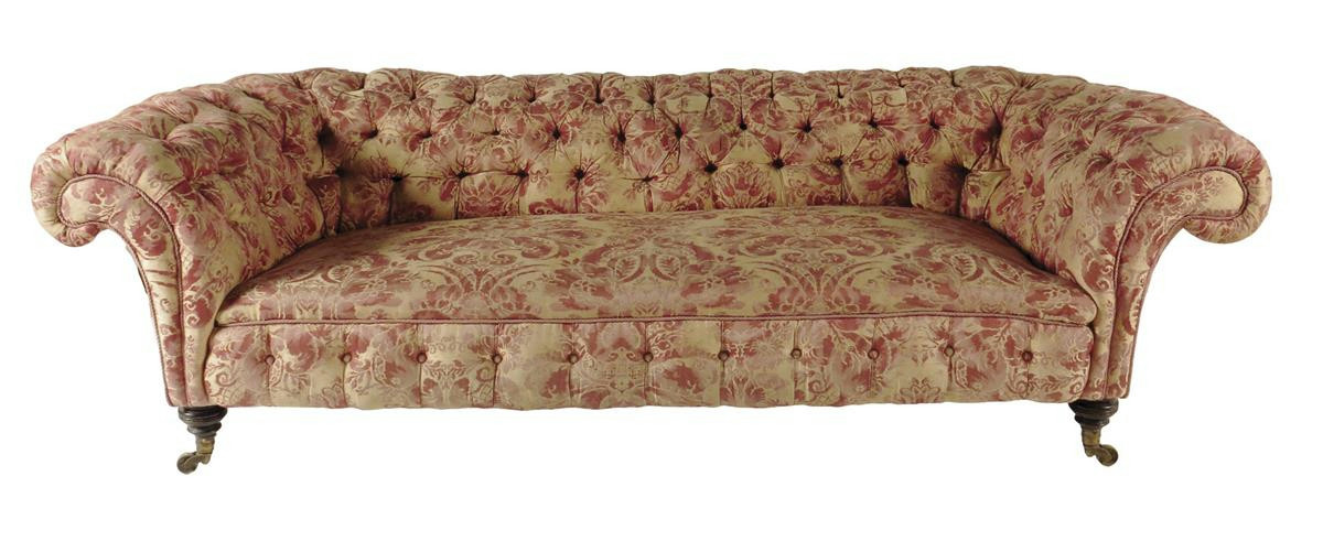 A late Victorian Chesterfield by Howard & Sons, with button upholstered damask fabric, with scroll arms on turned ebonized front legs and brass caps and castors stamped 'HOWARD & SONS, LONDON', the back left leg stamped '8837, 225', 67cm high, 231cm wide, 97cm deep.
