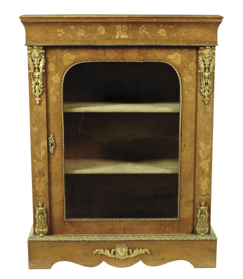 A Victorian walnut and floral marquetry pier cabinet, with ormolu mounts, the arched glazed door enclosing a plush lined interior with two shelves, 106cm high, 80.5cm wide, 32.5cm deep.