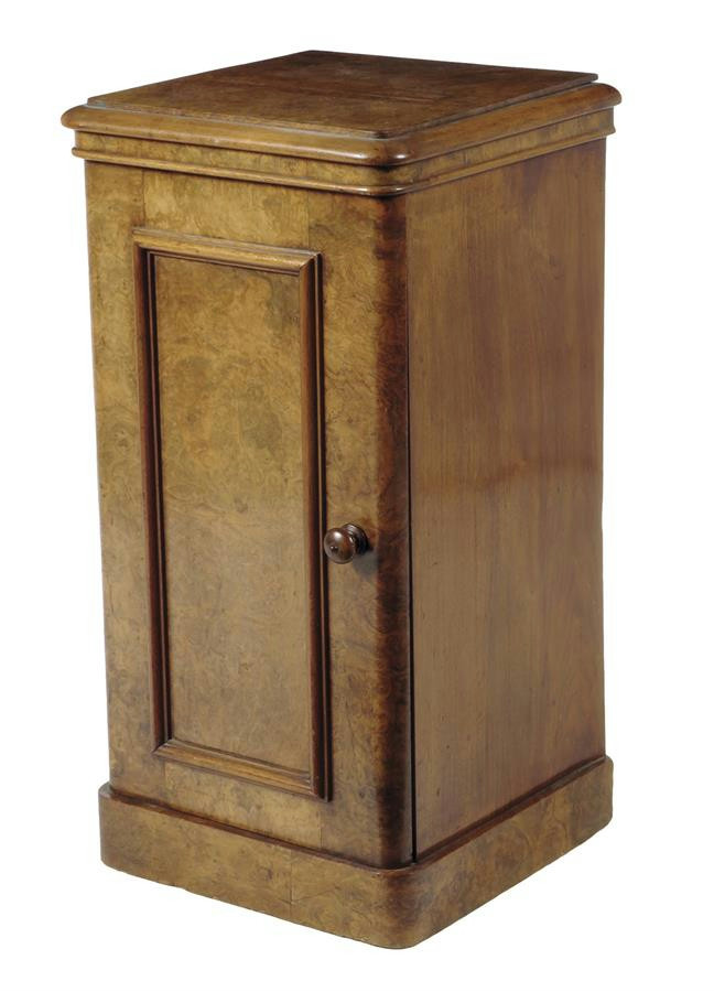 A Victorian burr walnut bedside cupboard, with a panelled door enclosing a shelf, 74.5cm high, 38.4cm wide, 37cm deep.
