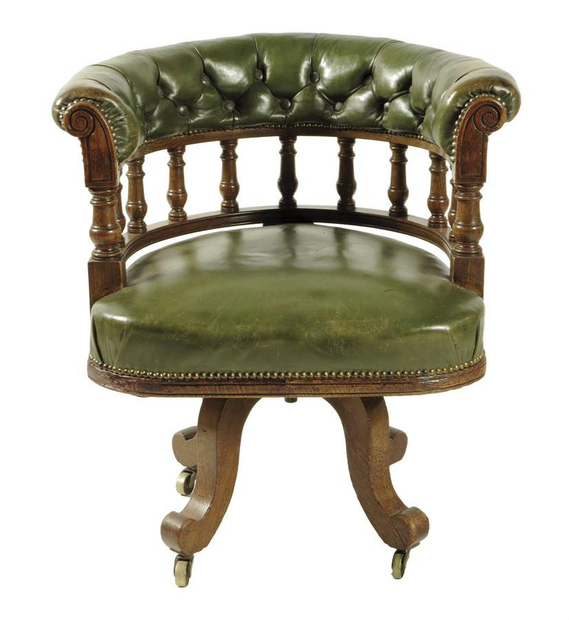 A late Victorian oak desk chair, with a swivel seat and with button upholstered green leather.