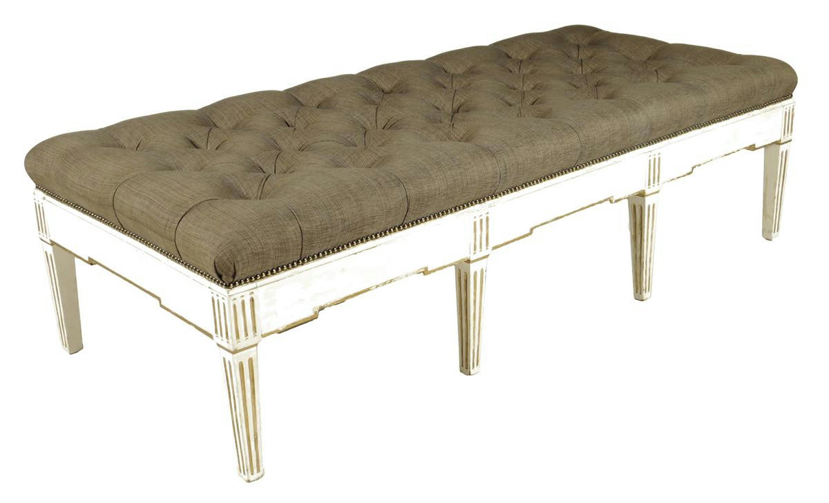 A large painted and parcel gilt stool in Adam style, the button upholstered seat on fluted tapering legs, 19th century elements, 42.5cm high, 163.5cm wide, 73.5cm deep.