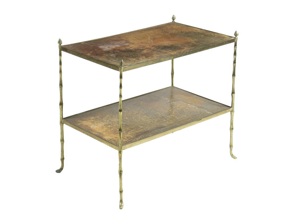 A gilt brass occasional table, the two tiers inset with gilt tooled leather surface, on naturalistic supports with cone finials, mid 20th century, 56cm high, 65.8cm wide, 40cm deep.