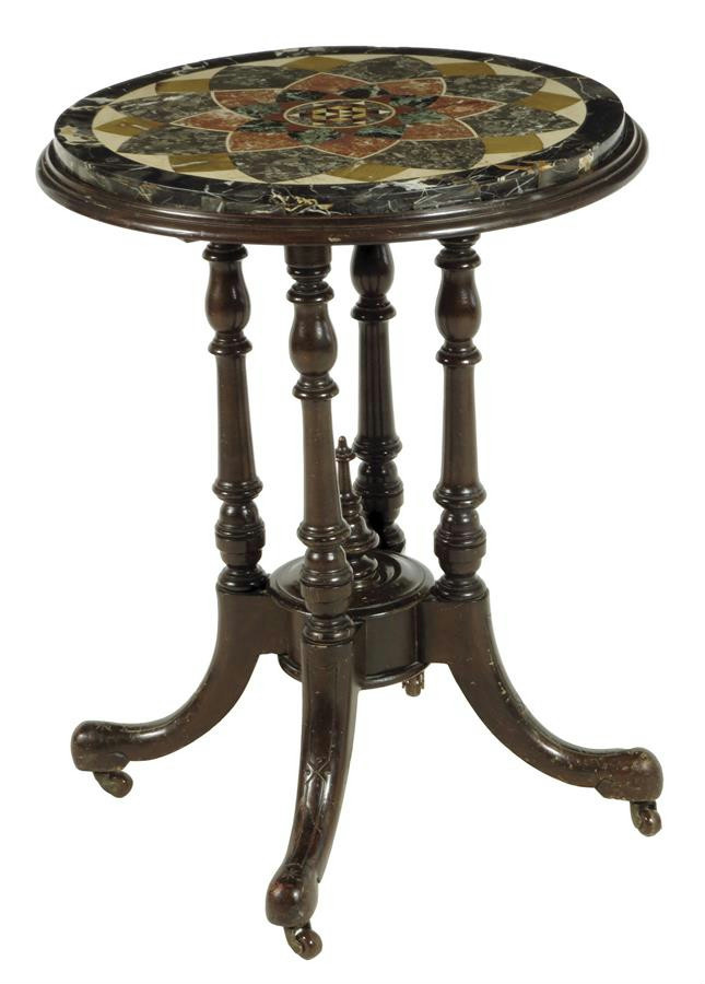 A Victorian occasional table, with a specimen marble top on an ebonized base with turned columns and ceramic castors, 71cm high, 56cm diameter.