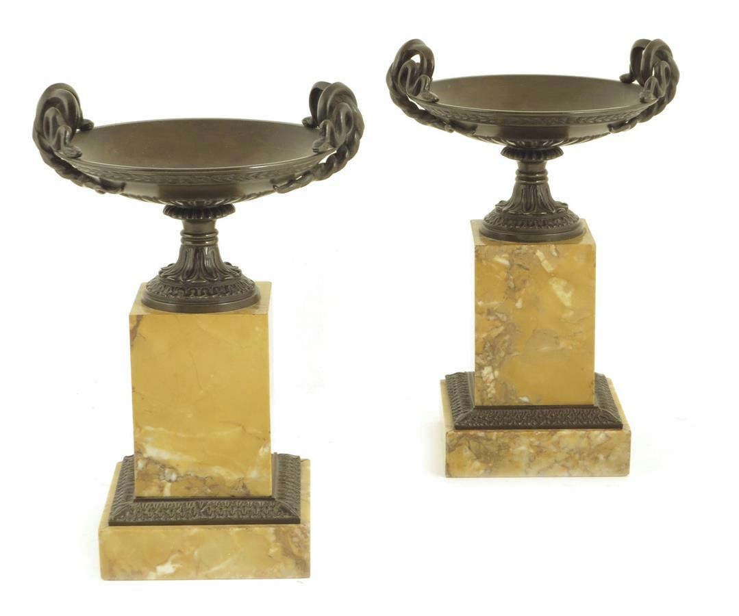 A pair of Louis Philippe bronze and Siena marble tazza, each with serpent handles on a stepped plinth, 24.4cm high, 16.8cm wide. (2)