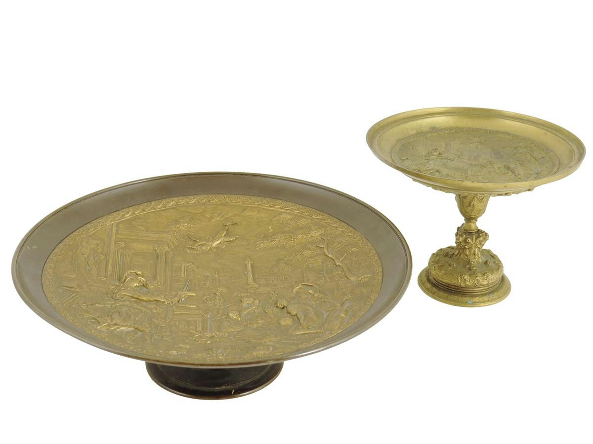 A late 19th century Italian gilt and patinated bronze tazza, decorated with a classical scene with Mercury and various other figures, 11cm high, 31cm diameter, together with a smaller tazza cast with the same scene. (2)
