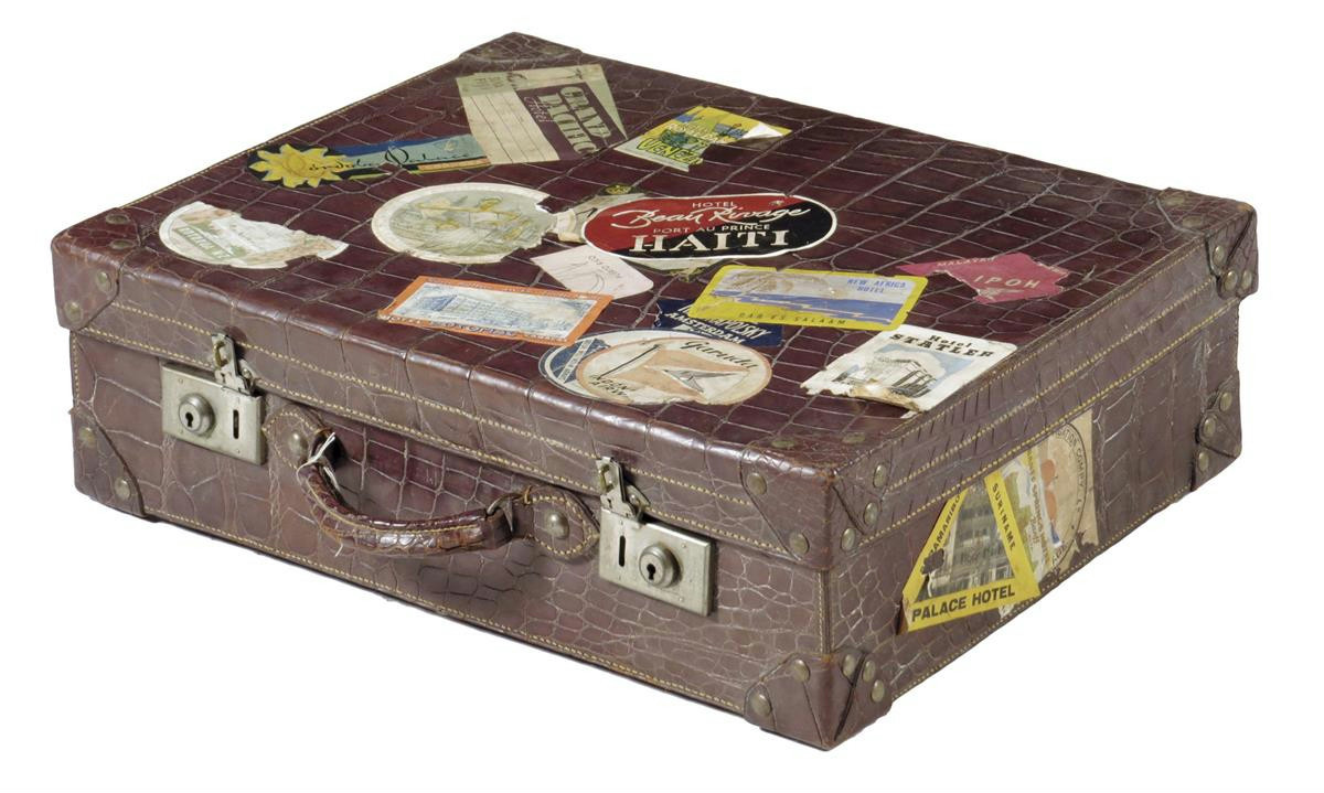 A crocodile leather suitcase, applied with various hotel labels, the interior originally fitted, early to mid 20th century, 17.7cm high, 57cm wide, 44.5cm deep.
