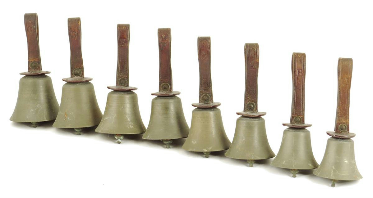 A graduated set of eight campanology brass hand bells