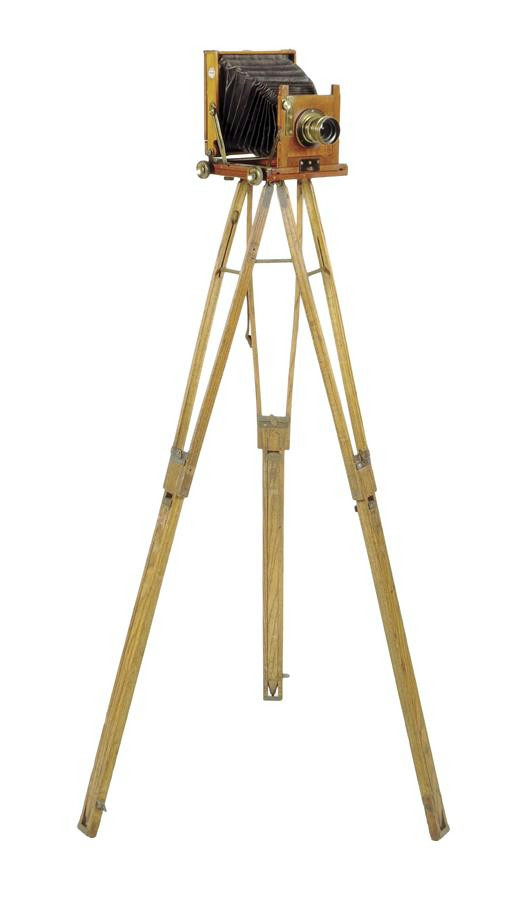 A Thornton Pickard 'Tribune' plate camera, with a brass lens and mounts on an adjustable folding tripod stand, 114.5cm high, 61cm wide.