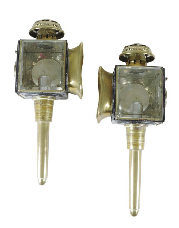 A pair of Victorian brass and black painted coaching lamps, 43.8cm high. (2)