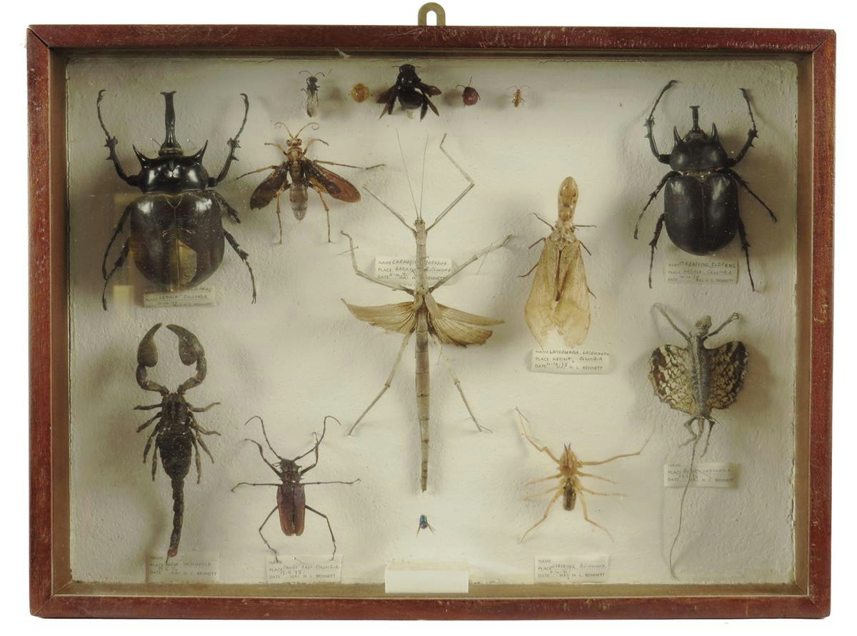 A collection of insects assembled by Major H L Bennett, including: two elephant beetles (Megasomaelephas) from Leticia, Columbia, an Indian stick insect (Carausius Morosus), from Botswana, a gliding lizard (Draco Sumatranus) from Bogor, Indonisia, all mounted in a glazed wood case, 33.4 x 43.5cm.