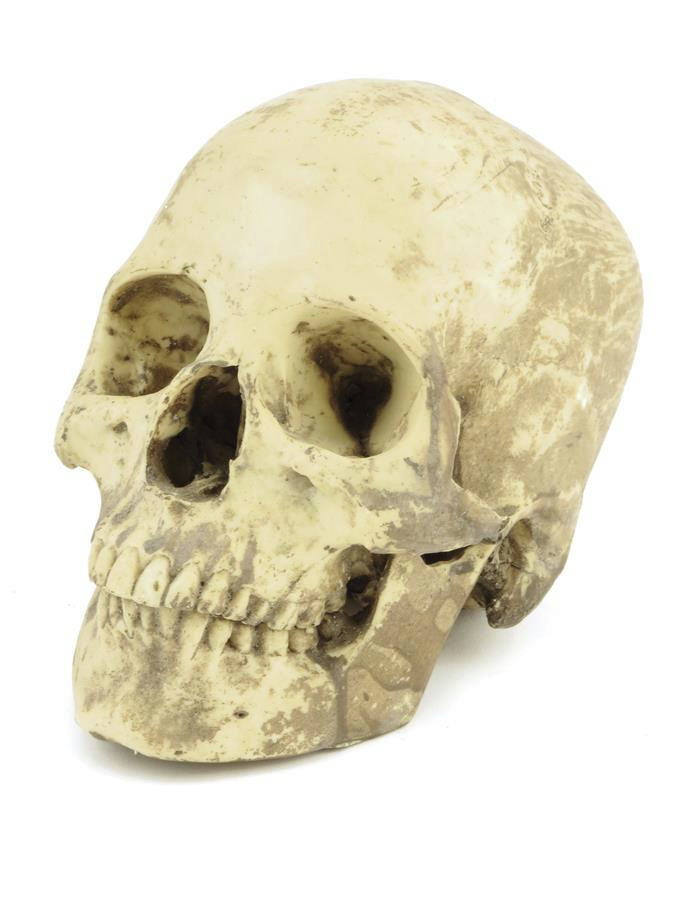 A cast resin model of a skull, with an articulated jaw, the underside inscribed 'ESP', 14.9cm high.
