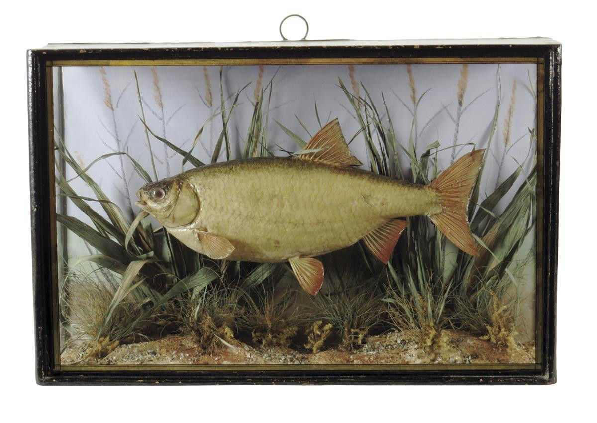 A taxidermied roach, mounted in a naturalistic setting with a Trade Mark label within an ebonized glazed case, 29cm high, 44.5cm wide, 12cm deep.