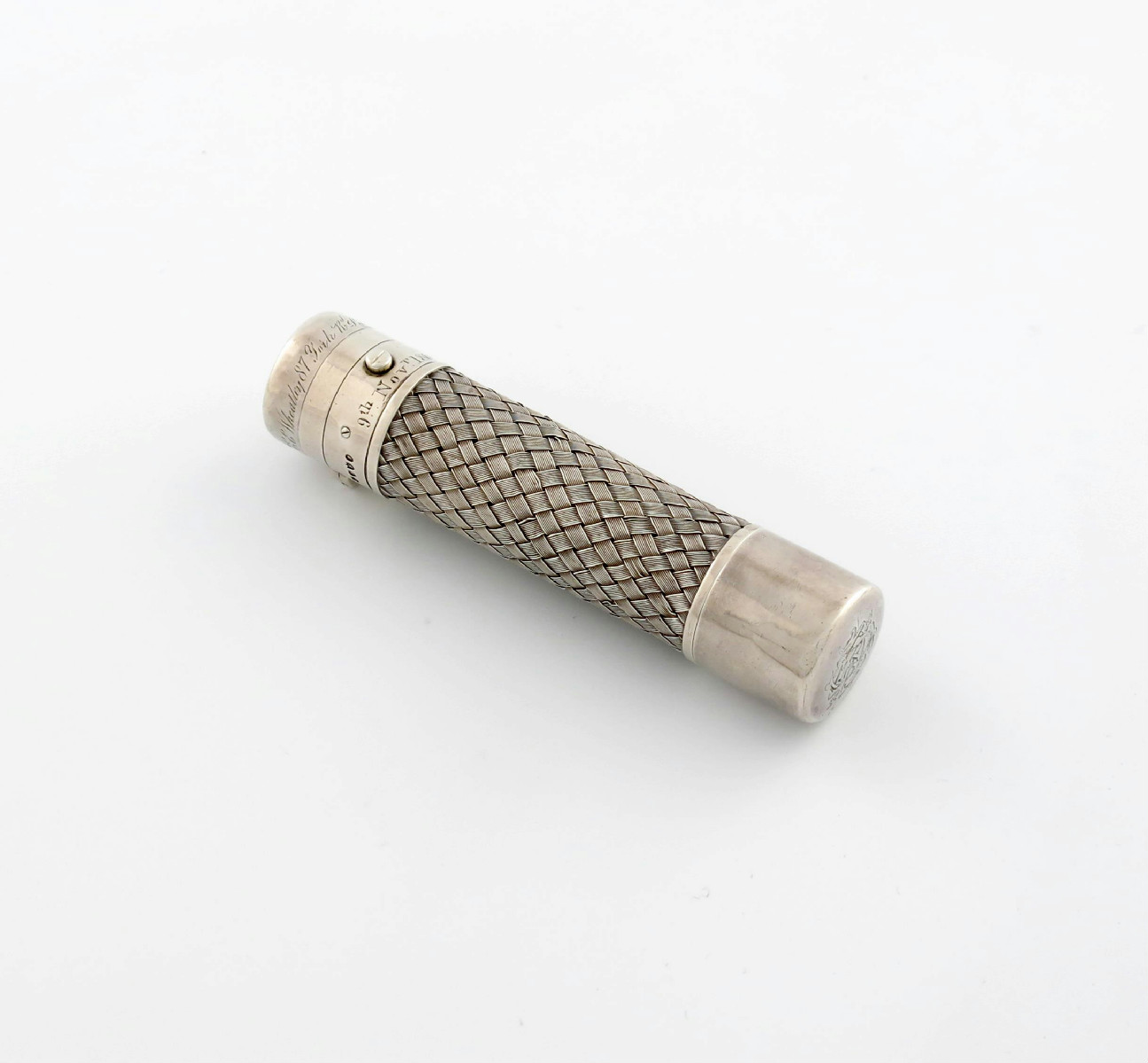 cylindrical form, inter-woven mesh decoration, the ends with a monogram, and the cover inscribed 'Mrs E.E.Wheatley, 87,York Road, Lambeth, SE', also engraved 9th Nov 1884', length 11.5cm.