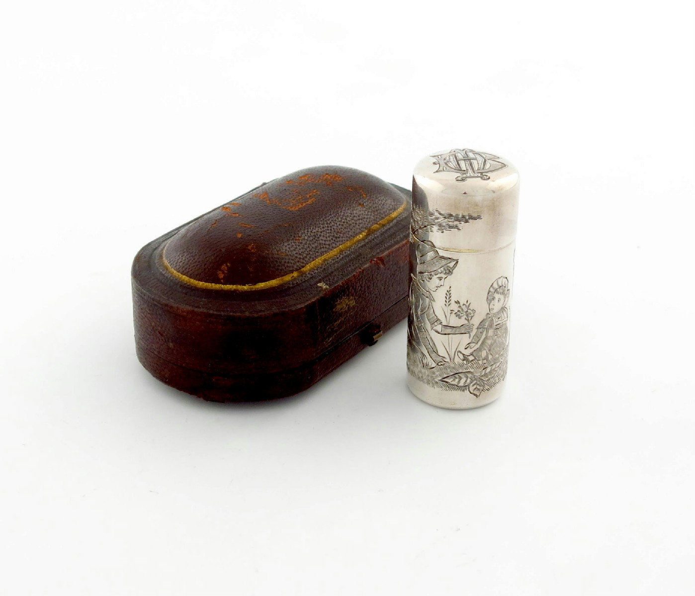 cylindrical form, engraved with Kate Greenaway children picking flowers, hinged cover, the interior with a pull-out silver-gilt mounted scent bottle, in a fitted case, length 5.5cm.