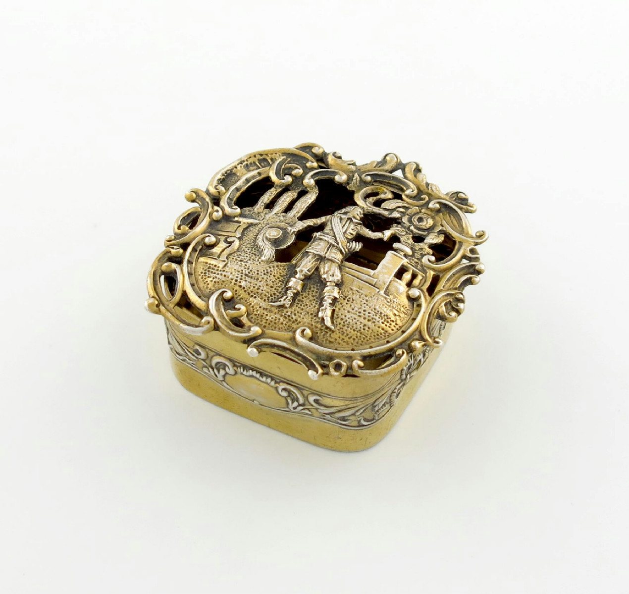 shaped rectangular form, the hinged cover embossed and pierced with a gentleman in a landscape setting, length 7cm, approx. weight 2.8oz.