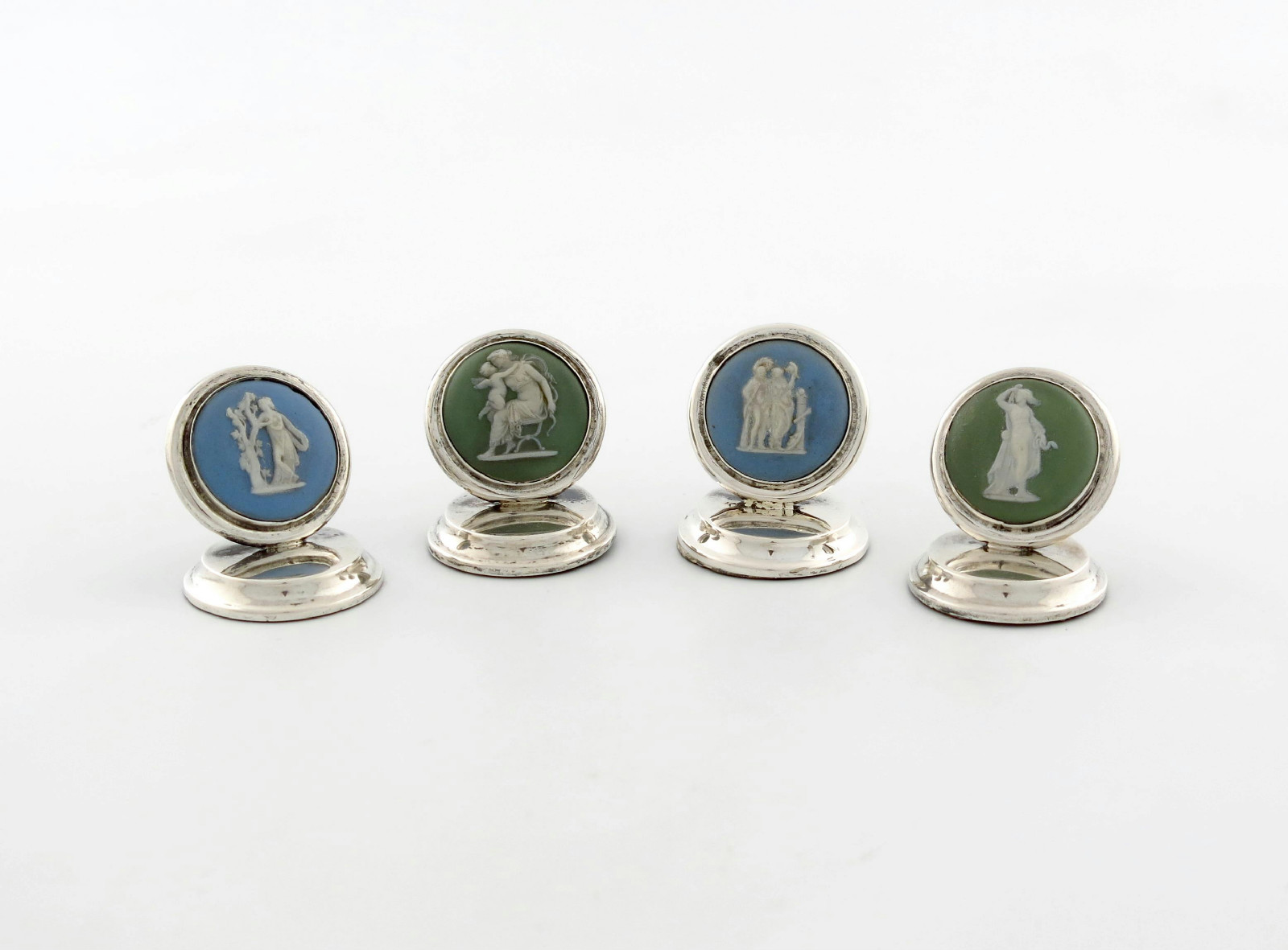 with two green and two blue Jasperware panels of classical figures, within plain silver mounts, on raised circular bases, height 3.3cm. (4)
