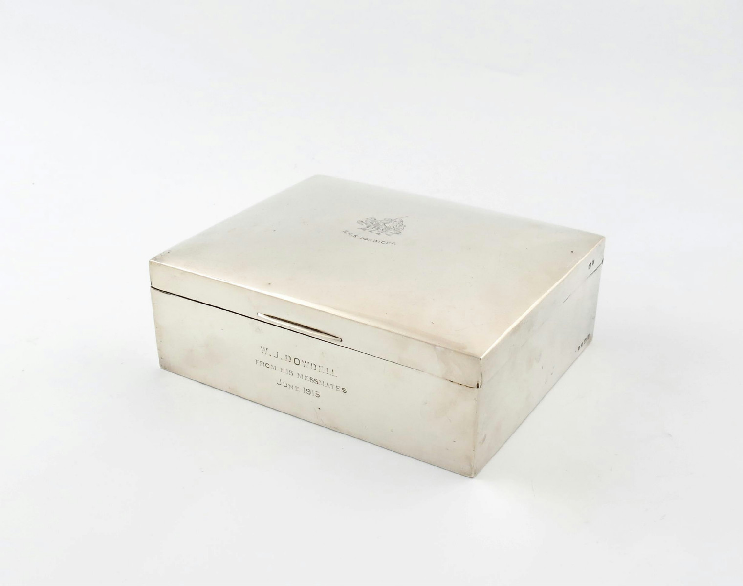 rectangular form, the hinged cover engraved with an image of Boadicea and engraved 'H.M.S BOADICEA', the front inscribed ' W.J. DOWELL FROM HIS MESSMATES JUNE 15', wood lined, length 20.5cm.