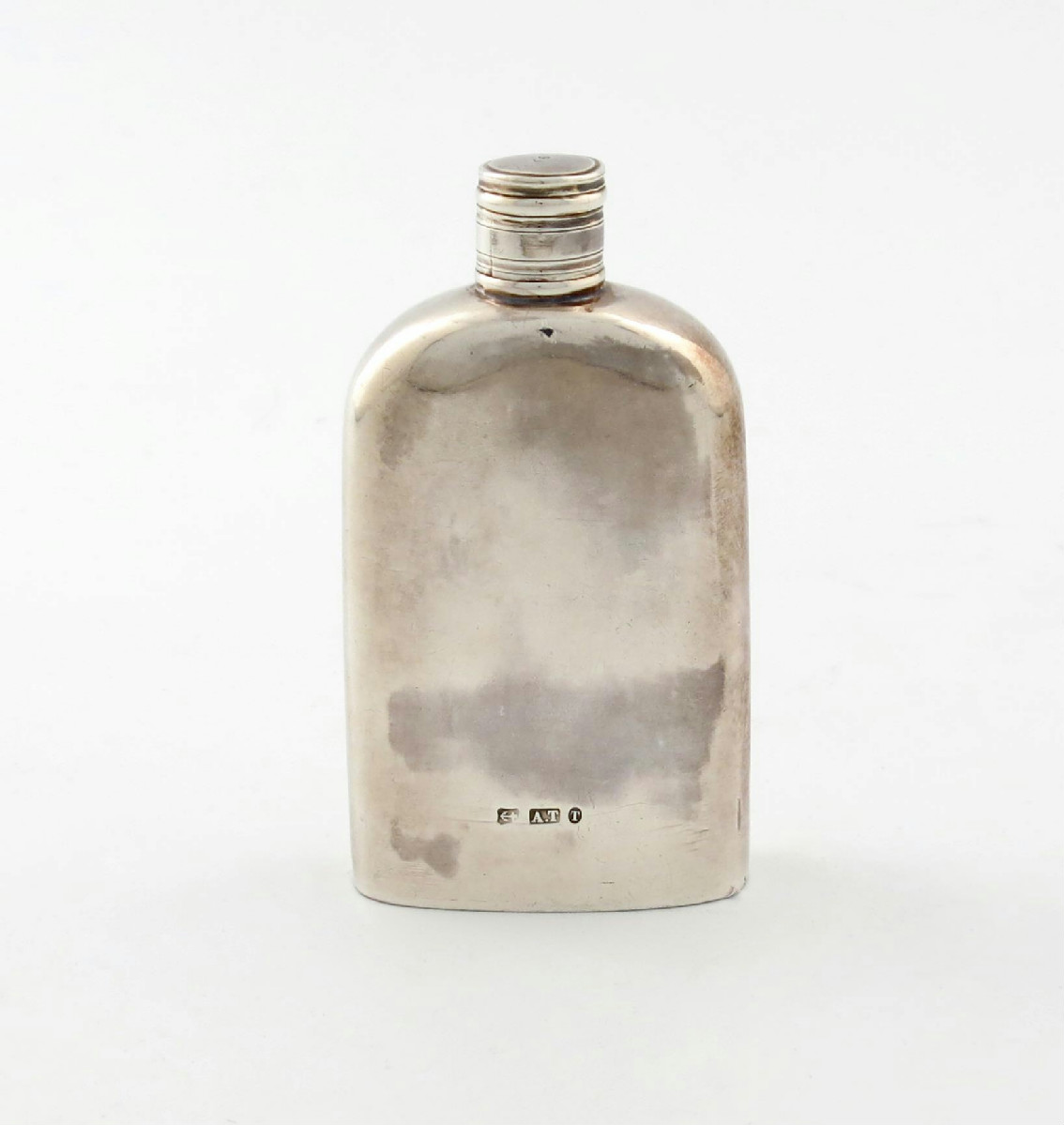 rounded rectangular form, screw-off cover, with a monogram within a strap surround, height 10.7cm, approx. weight 2.7oz.