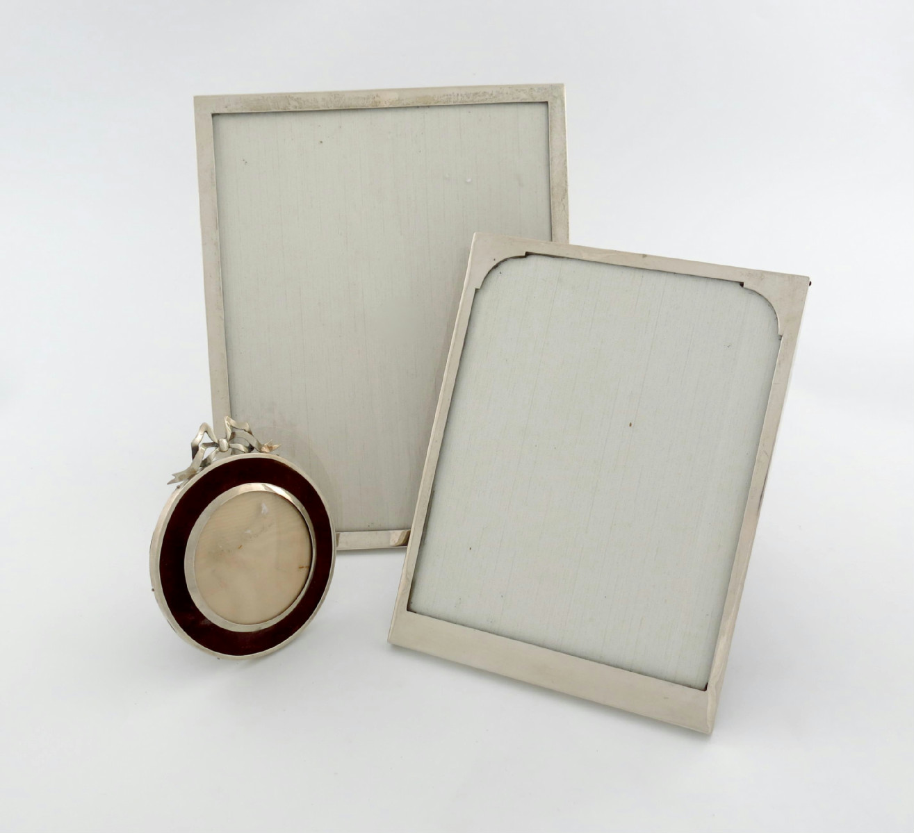 upright rectangular form, easel back, height 25.7cm, plus another silver photograph frame of rectangular form, Birmingham 1923, and a circular silver photograph frame. (3)
