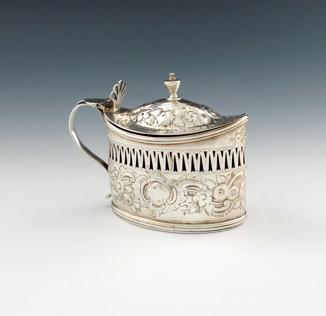 oval form, pierced border, later foliate scroll decoration, scroll handle, the domed cover with an urn finial, with a blue glass liner, length 11cm, approx. weight 3.4oz.