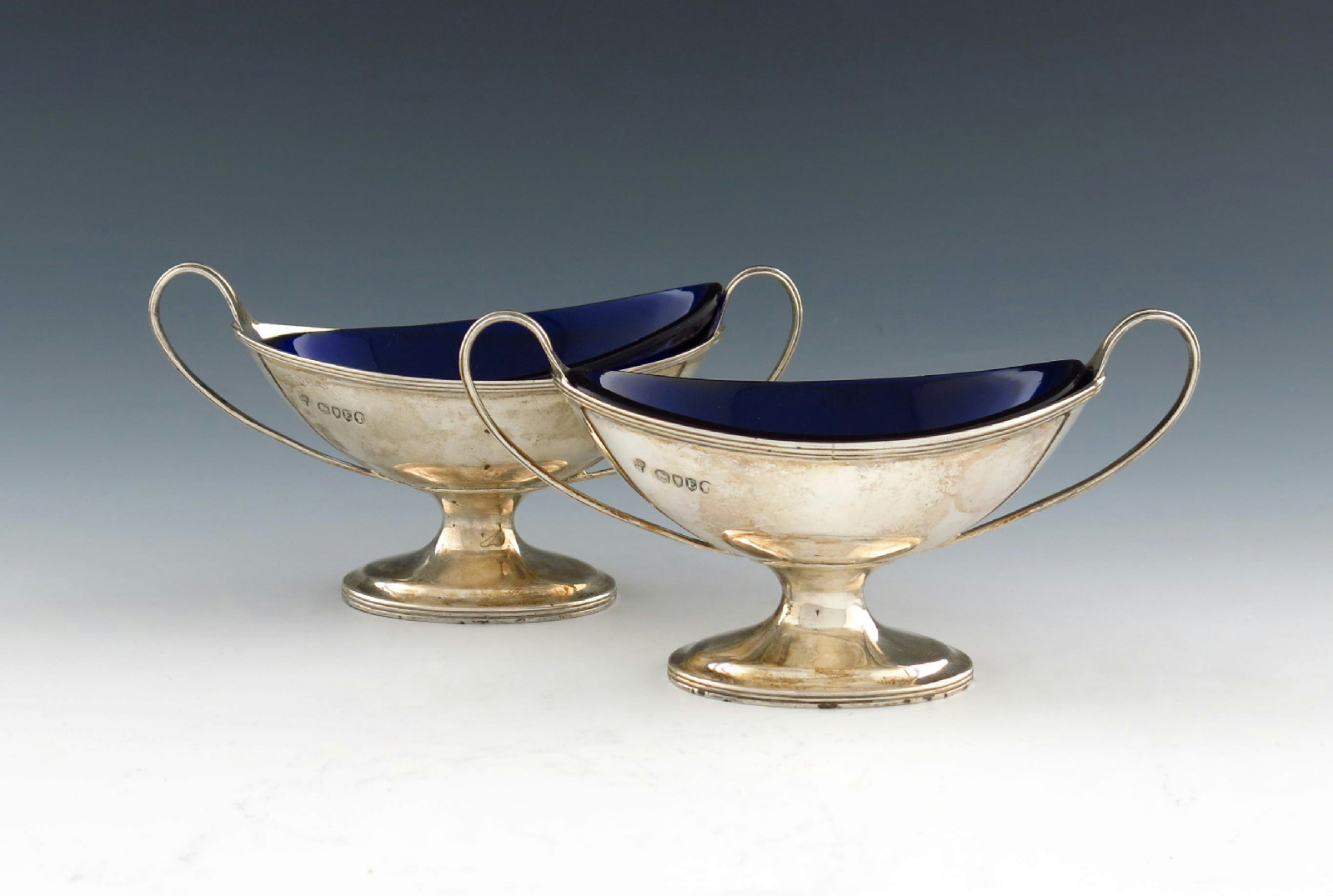 oval form, scroll loop handles, on a raised oval foot, with blue glass liners, length 14.5cm, approx. weight 5oz. (2)