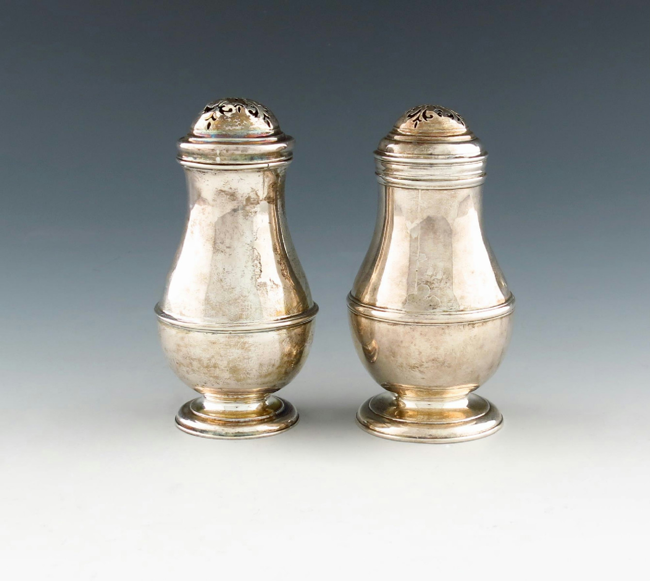 baluster form, the domed cover pierced with foliate scroll work, plus another George I silver bun caster, maker's mark worn, London 1722, baluster form, the domed cover pierced with foliate scroll work, height 11.8cm, approx. weight 8oz. (2)