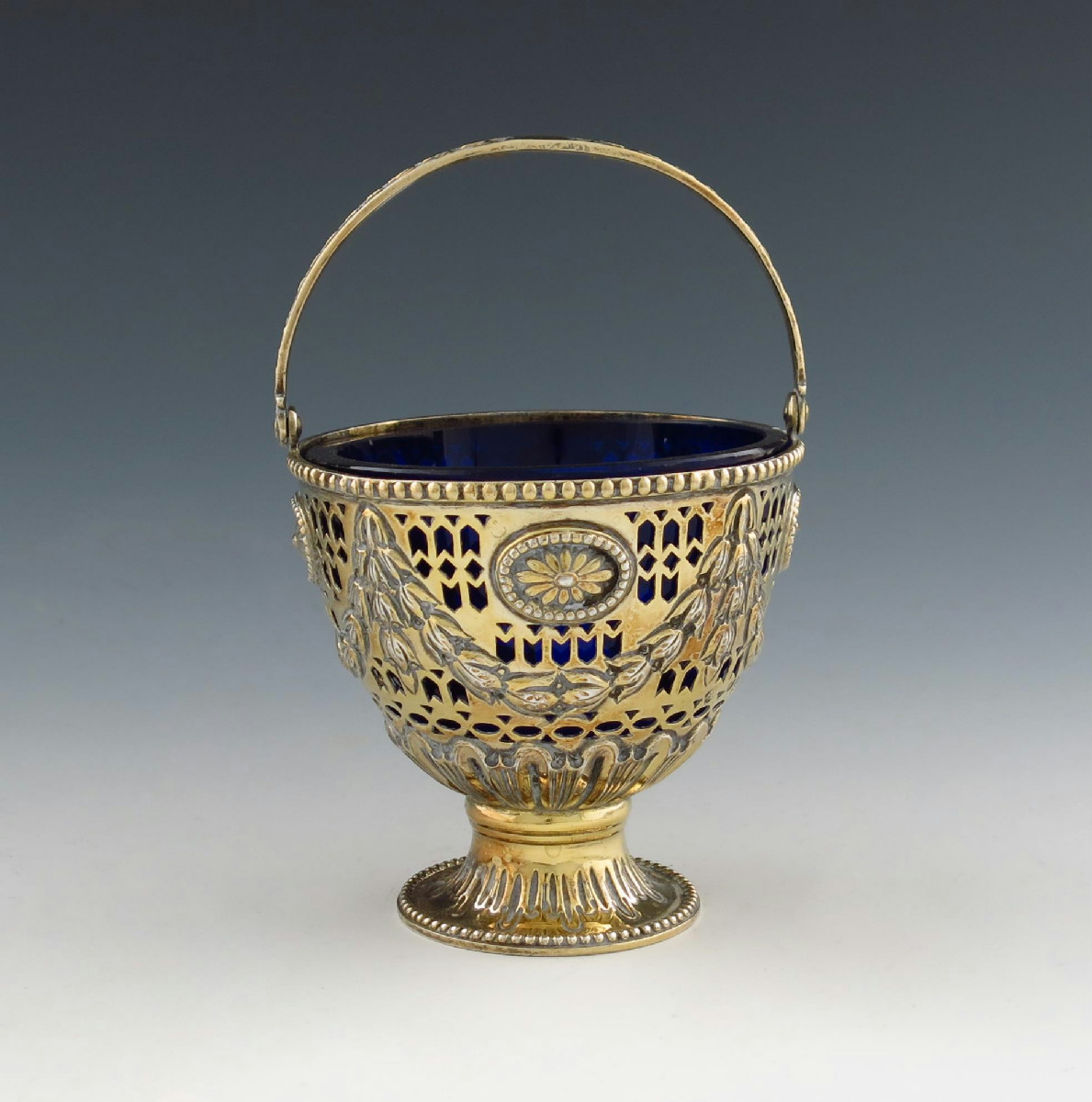 vase form, with pierced decoration and embossed with swags and medallions, beaded borders, on a raised circular foot, with a blue glass liner, height 7.5cm, approx. weight 3.2oz.