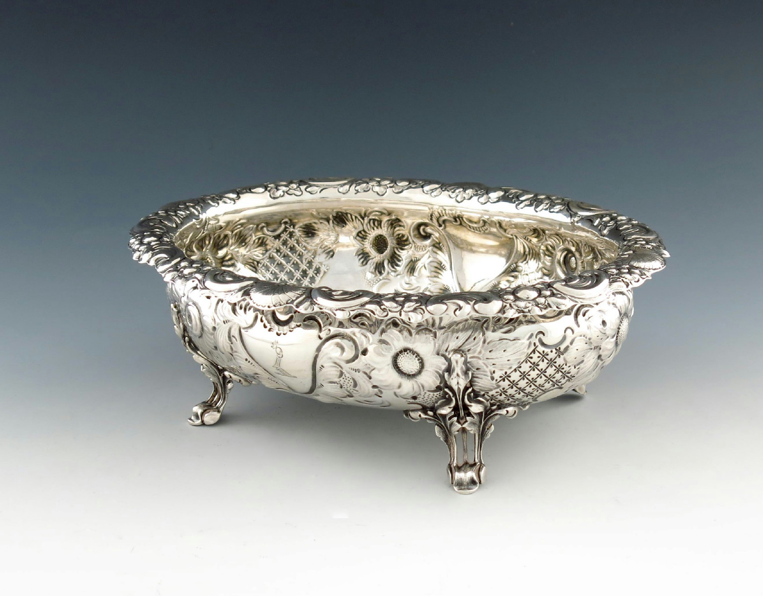 oval form, embossed foliate scroll and trellis decoration, foliate border, on four pierced scroll feet, length 24cm, approx. weight 12oz.