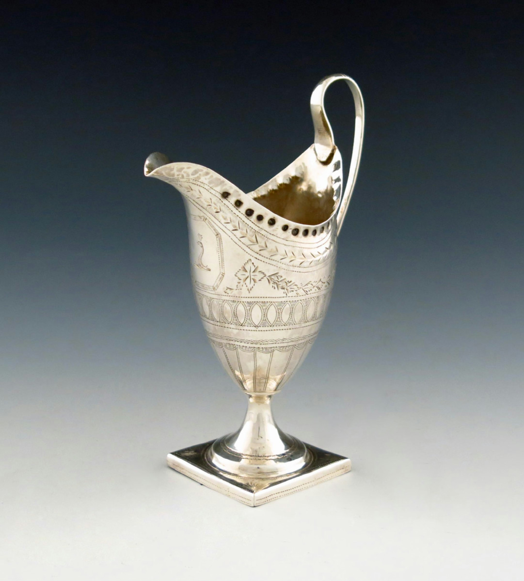 helmet form, bright-cut decoration, punch bead border, scroll handle, on a raised square foot, height 16.2cm, approx. weight 3.2oz.