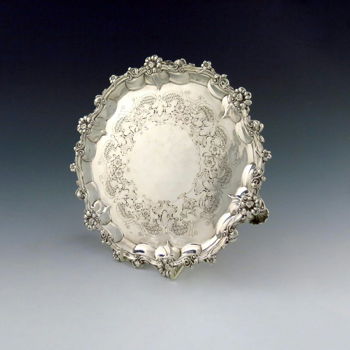 circular form, foliate and scroll border, engraved foliate decoration, on three pierced bracket feet, diameter 24.2cm, approx. weight 17.5oz.