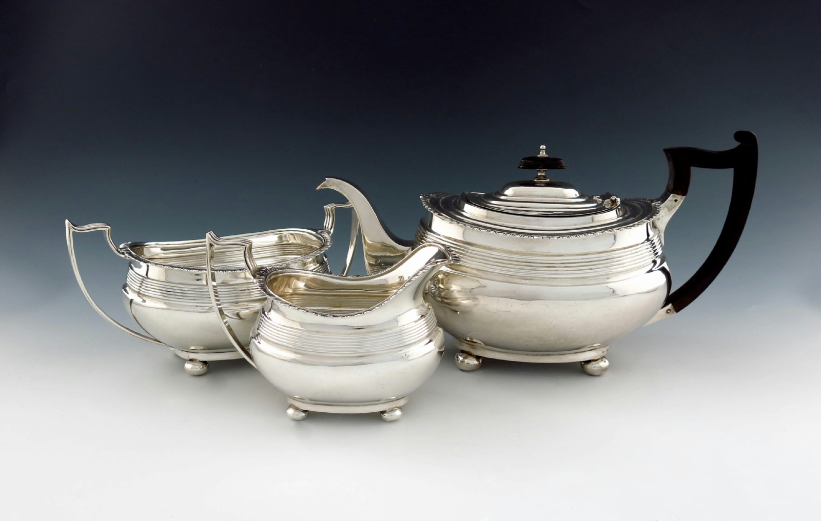 oblong bellied form, reeded girdle, gadroon borders, scroll handles, on four bun feet, length handle to spout 28.5cm, approx. weight 36oz. (3)