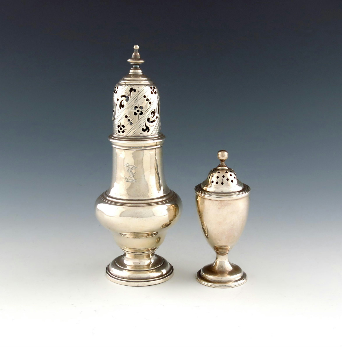 baluster form, the pull-off cover with a knop finial, on a raised circular foot, height 18cm, plus a George III silver pepper pot, of vase form, ball finial, on a raised circular foot, by James Mince, London 1794, height 10cm, approx. total weight 8oz. (2)