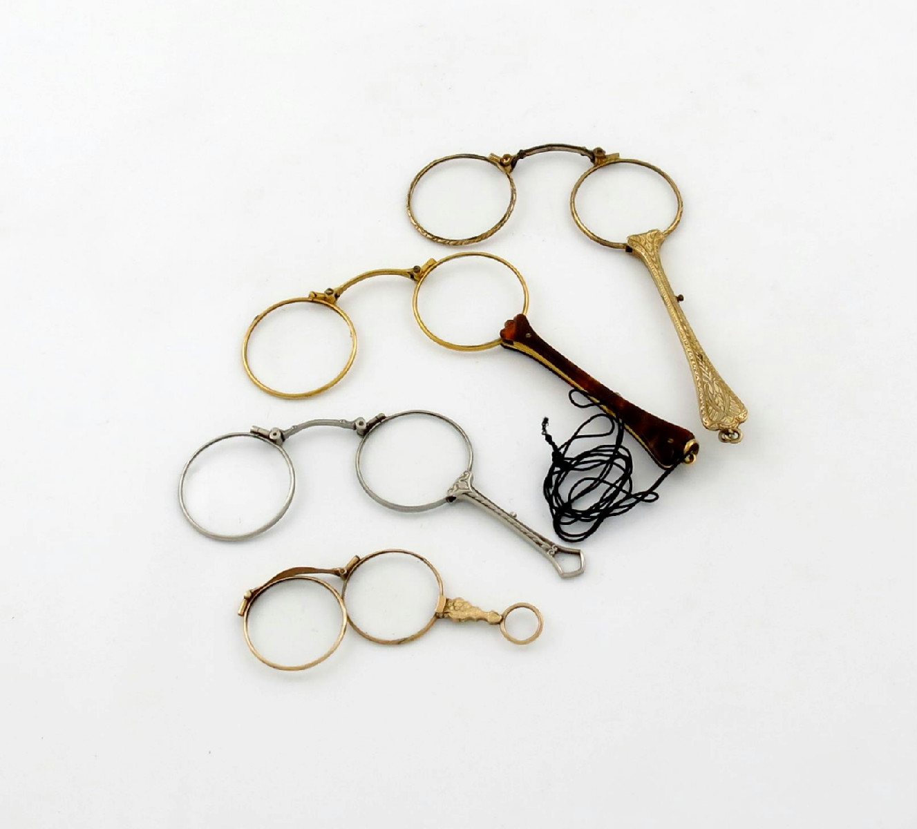 tapering handle, plus two other pairs of gilt metal lorgnettes, and a plated pair of lorgnettes. (4)