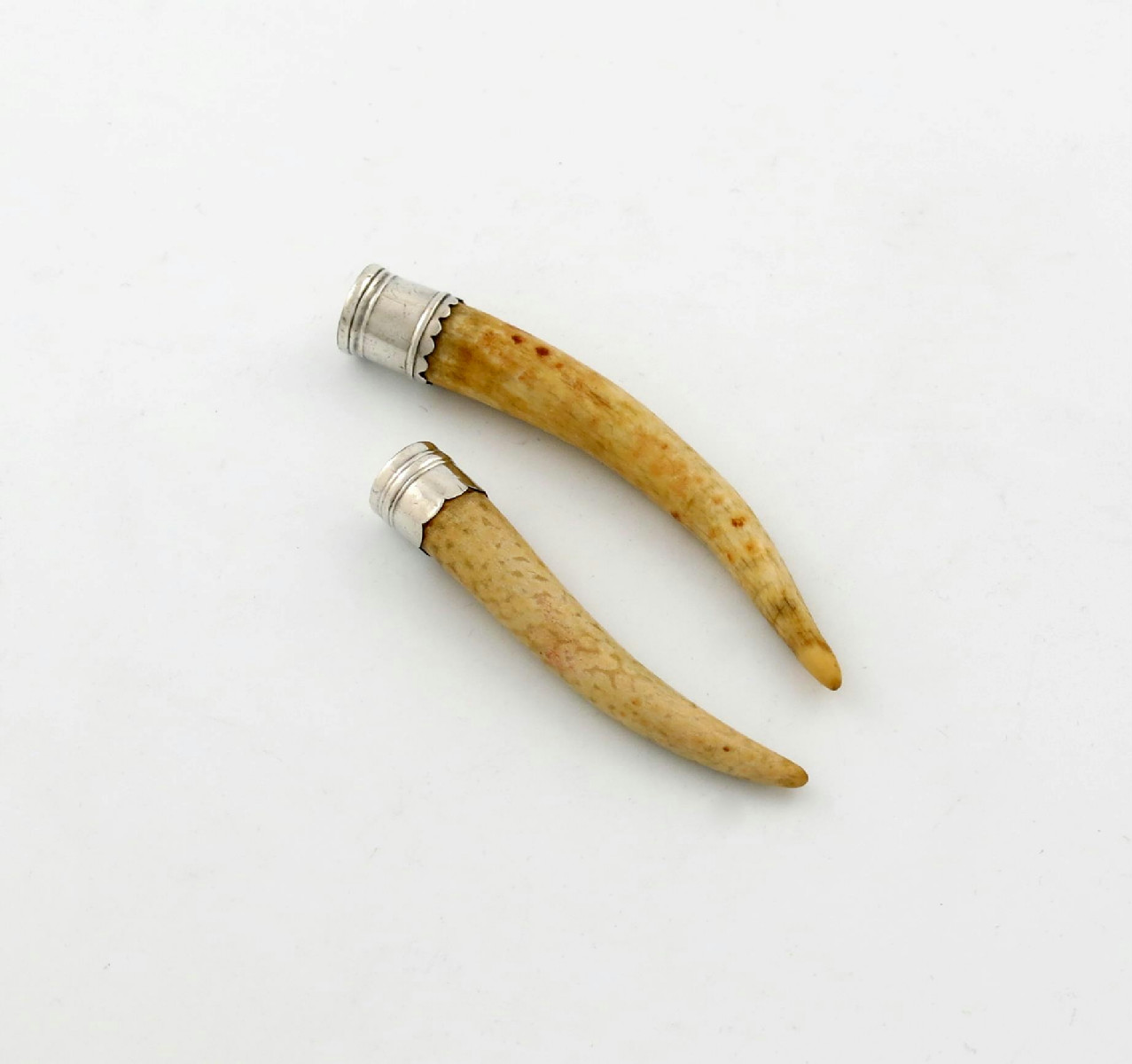 Two late 18th century silver-mounted boar's tusk pipe tampers,